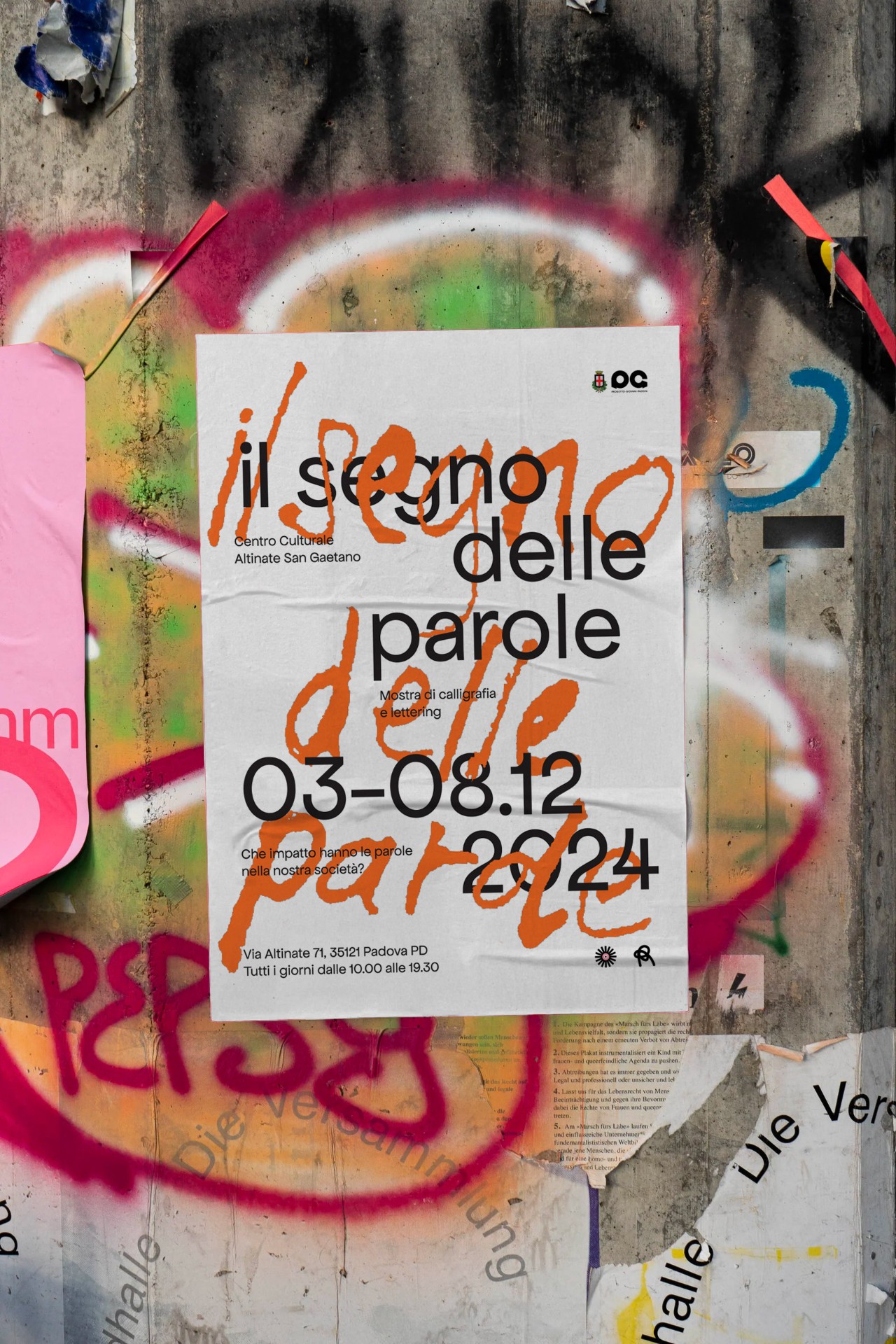 Tra il 3 e l’8 dicembre 2024 si è tenuta a Padova presso il Centro Culturale Altinate San Gaetano la mostra “Il Segno delle parole”. Sono stati esposti 27 manifesti che, attraverso l’uso della calligrafia e del lettering, esplorano l’impatto delle parole nel plasmare la nostra percezione del mondo, con una particolare attenzione alle tematiche di genere. Le opere sono state realizzate da 100 ragazzi e ragazze durante il laboratorio universitario di calligrafia e lettering tenuto dalla calligrafa e designer Anna Schettin.