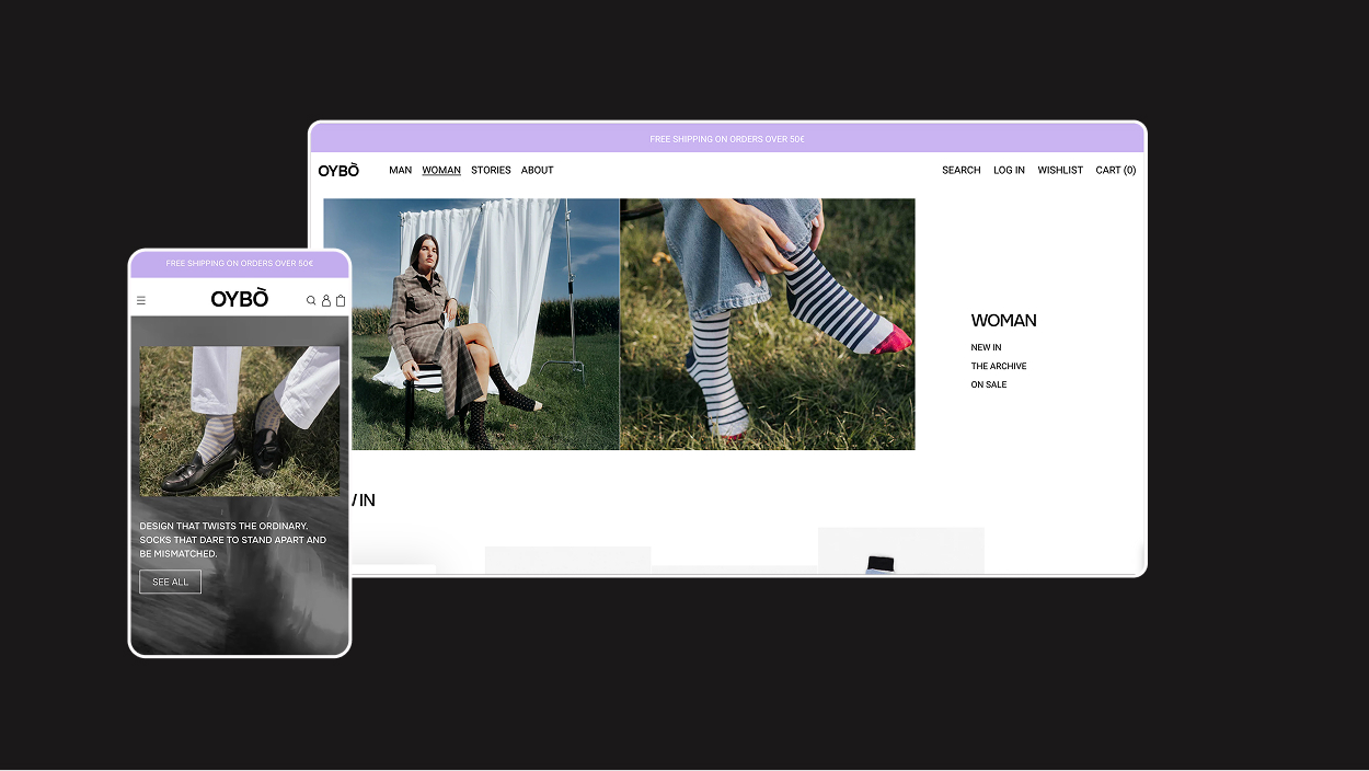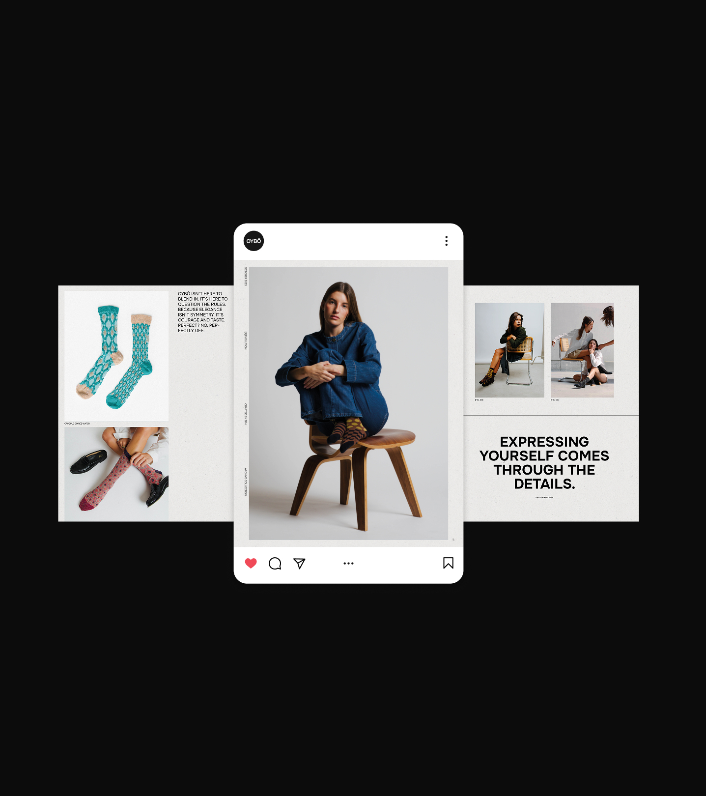 Per OYBÒ ho curato un restyling completo dell'identità lavorando su una strategia che mette l’errore al centro del racconto: le calze spaiate diventano la cifra identitaria del brand, l'errore è il modo di parlare del brand a persone curiose e non conformiste.