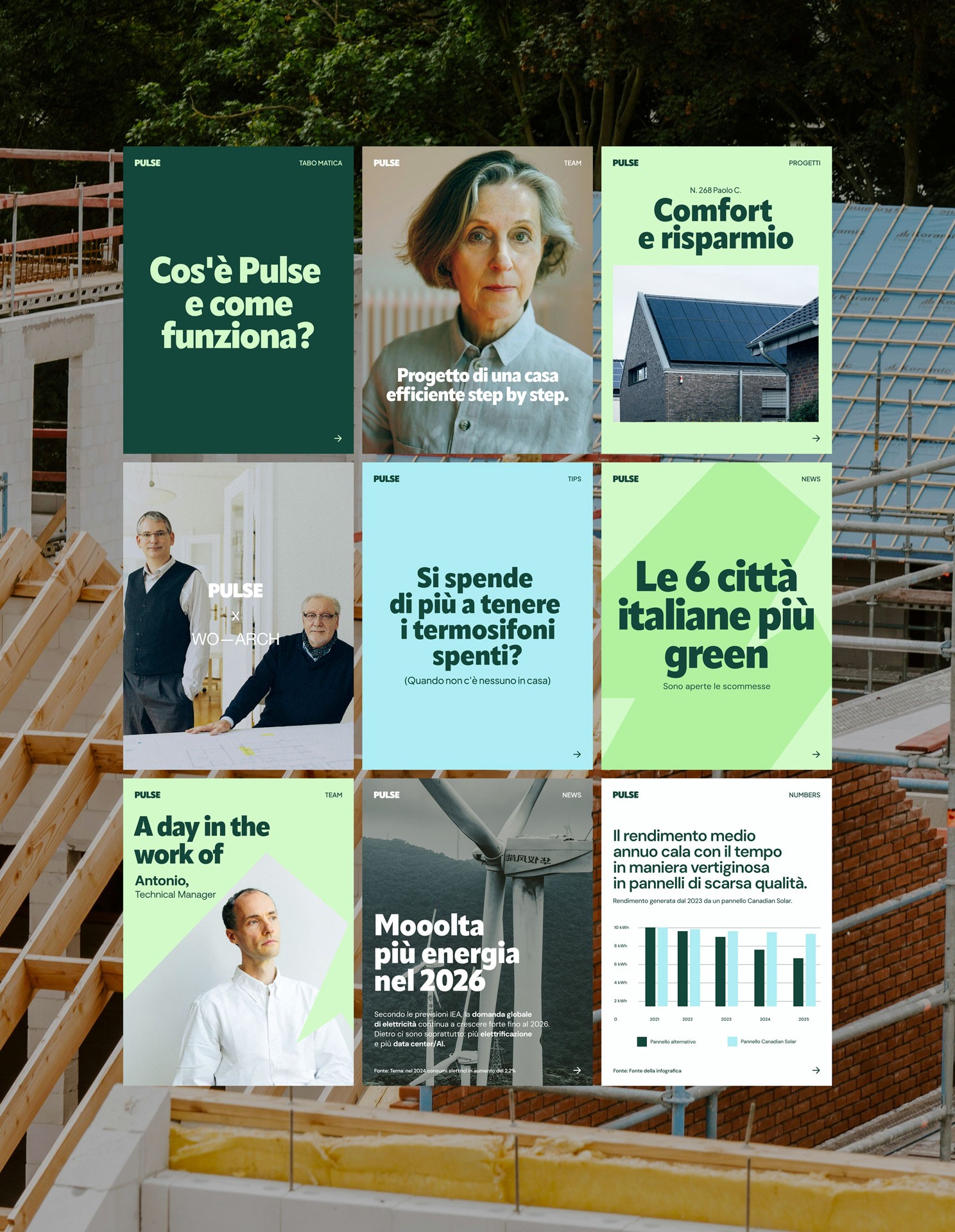 Pulse è una start-up che rende l’efficienza energetica più semplice e accessibile: progetta e installa soluzioni per la sostenibilità di case e aziende, collaborando con studi di architettura e imprese edili per costruire abitazioni sostenibili e comunità energetiche. Il cuore del brand non è “vendere a tutti i costi”, ma aiutare le persone a scegliere con consapevolezza, mettendo al centro comfort, risparmio e un futuro più informato.