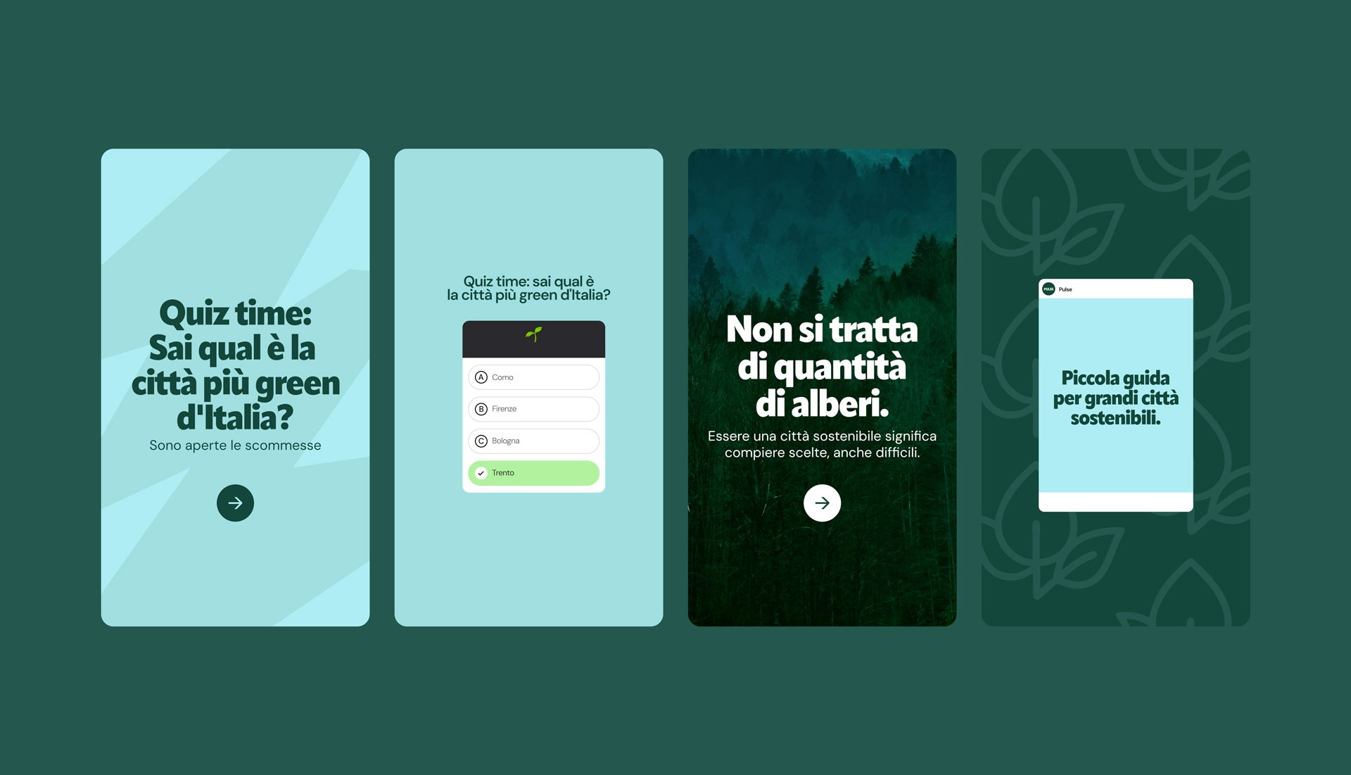 Per Pulse ho progettato logo, identità visiva e contenuti per i social media. Ho scelto una palette tra verde e azzurro per comunicare serenità, calma e fiducia, bilanciandola con una tipografia bold, decisa e contemporanea: un mix che rende il brand giovane, riconoscibile e adatto a una start-up in crescita. Il sistema si completa con un set di icone, illustrazioni e pattern grafici pensati per spiegare anche i concetti più tecnici in modo chiaro, coerente e immediato.
