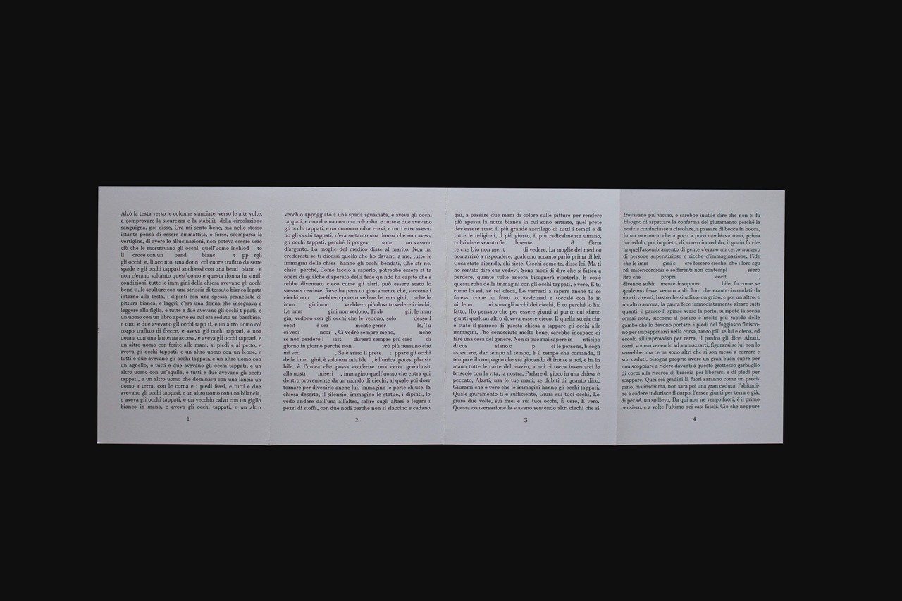 Ho trasposto graficamente i tre concetti centrali del romanzo: la velocità, la cecità e l'identità, strettamente connessi.